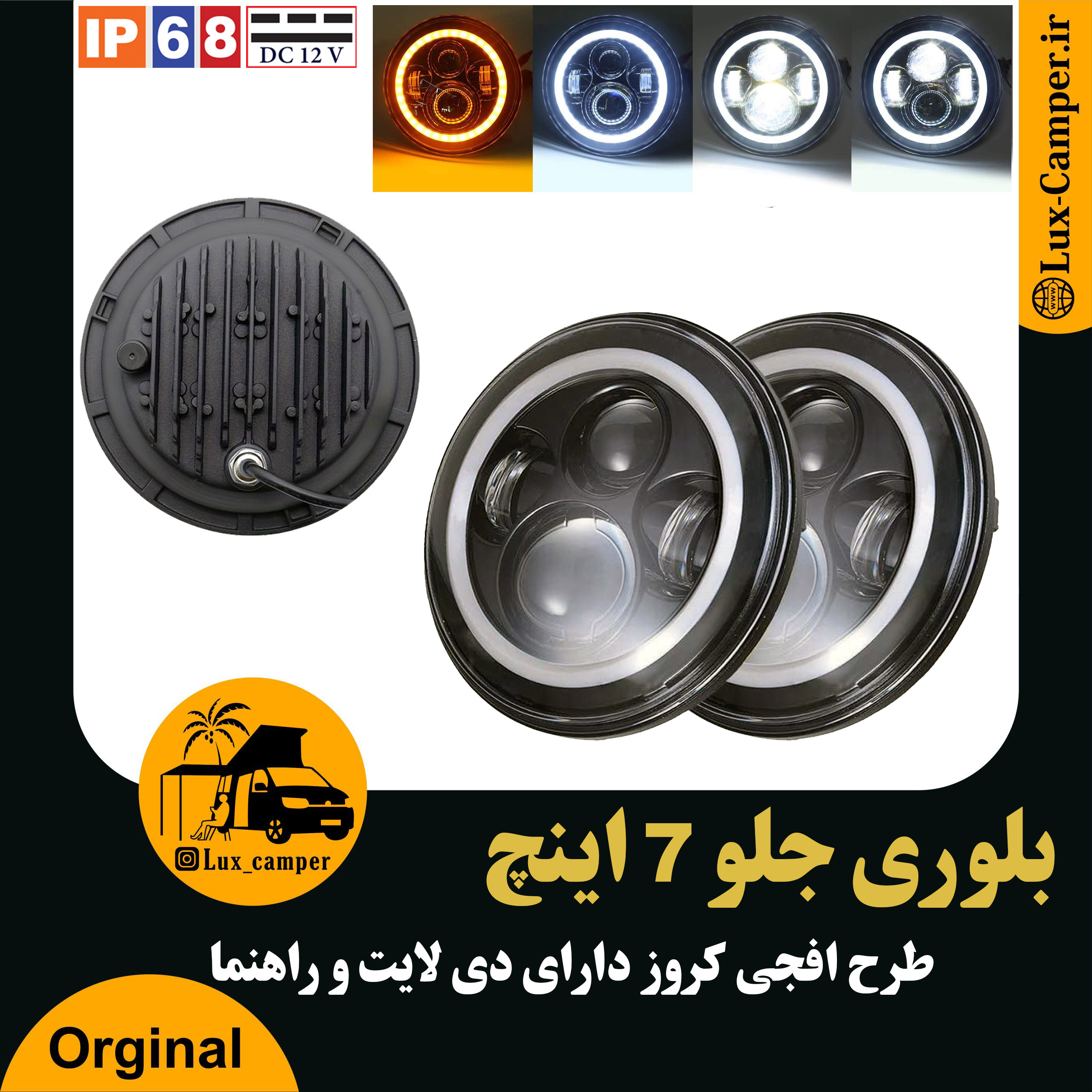 بلوری جلو طرح افجی کروز دارای نئون با دو رنگ سفید و نارنجی میباشد. این چراغ 7 اینچی دارای نور بالا و پایین بوده که قابل نصب رو تمامی خودروهای چراغ گرد(7اینچ) میباشد.و به دلیل نوردهی بسیار عالی در عین زیبایی از محبوبیت زیادی در جامعه خودروهای آفرودی برخوردار هست. این محصول مطابق با الزامات DOT طراحی و ساخته شده که تاثیر بسزایی در نوع و کیفیت نوردهی و همچنین دوام این محصول در شرایط سخت می گذارد.